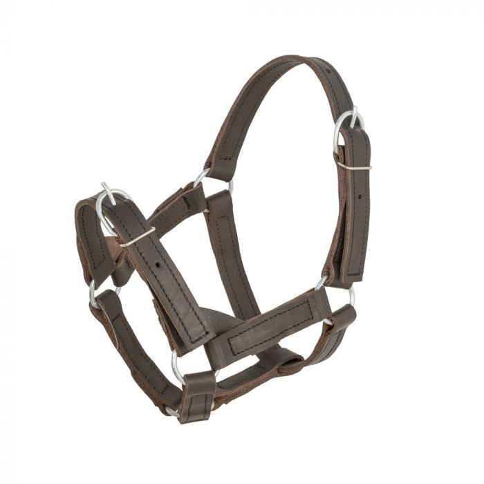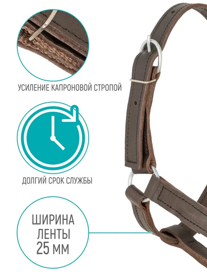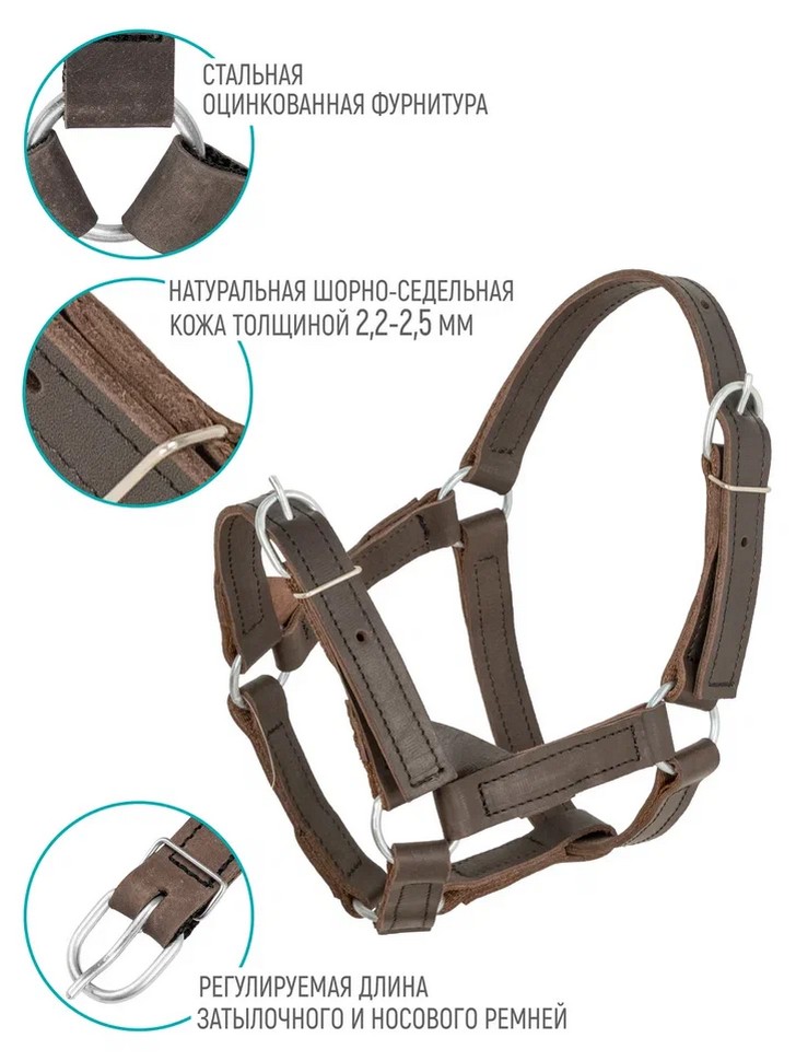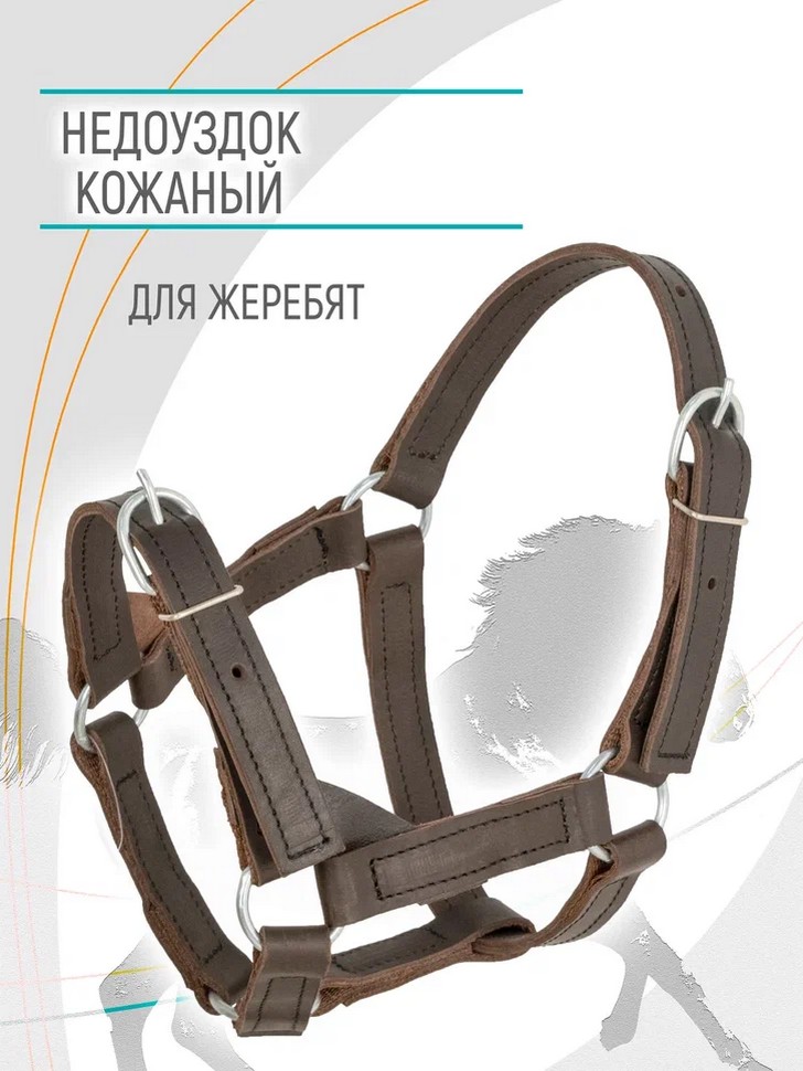 Недоуздок это часть конной упряжи. Необходим для содержания лошади на привязи. Изготовлен из натуральной шорно-сидельной кожи (2,2-2,5 мм) шириной 25мм, Пряжки полукруглые, кольца металлические. Вся фурнитура сварная, оцинкованная. Повод в комплект не входит. Подходит для жеребят и лошадей малых пород, регулируется по размеру. A - 38 см B - 34 см C - 11 см D - 12 см E - 26 см F - 13 см