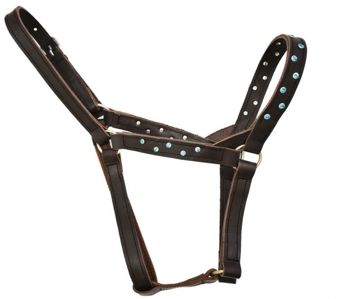 Недоуздок это часть конной упряжи. Необходим для содержания лошади на привязи. Изготовлен из натуральной шорно-седельной кожи (2,2-2,5 мм), шириной 25мм. Изделие украшено стразами ( d-0.8мм ). Пряжки полукруглые, кольца металлические. Вся фурнитура сварная, оцинкованная. Повод в комплект не входит. A - 54 см B - 57 см C - 13 см D - 21 см E - 41 см F - 18 см