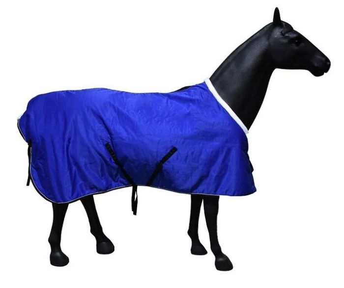 Размер L (длина по спине 160 см) . Попона изготовлена из плотной смесовой ткани, подклад один слой синтепона, нижний слой к телу изготовлен из 100 % бязи. На груди два ремня на пряжках шириной 20 мм, два ремня на животе шириной 30 см, фиксация попоны под хвостом капроновым ремешком на фастекс. По краю попоны вшит декоротивный серебристый кант.