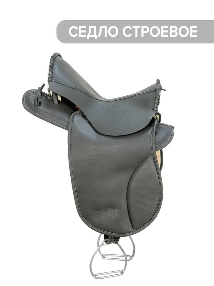 Седло состоит :1) Ленчик (центральный сыромятный ремень, привязан кожаным шнуром, по центру пришит войлок) 2) Лыжи войлочные ( Войлок 10 мм, карманы из кожи 3,1+ мм, прошиты по краю толстой армированной нитью) 3) Крылья для седла с вальцами (изготовлены из толстой кожи с внутренней стороны прошит войлок, край окантован тонкой кожей) 4) Крышка (сидушка) изготовлена из кожи 3,1+ мм, прошита толстым кожаным шнурком 5) Подпруга ( изготовлена из плотной хлопковой ленты ширина 7 см) 6) приструга ( изготовлена из сыромятной и ШС кожи, усилена капроновой стропой) 7)Ремень стременной двойная толстая кожа 30мм, роликовые пряжки 8) стремена металлические пара 9 ) Потник для седла кирза (изготовлен из войлока 10 мм, покрыт кирзой высокого качества, окантован тонкой натуральной кожей, ремни для фиксации изготовлены из натуральной кожи)