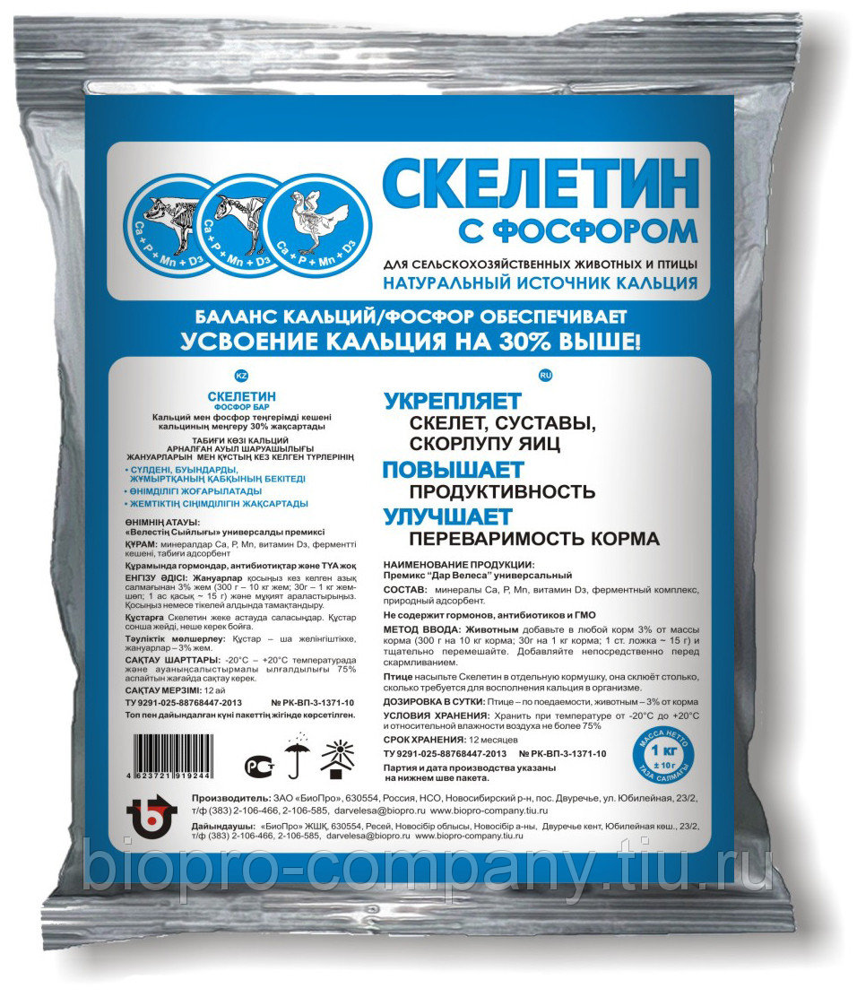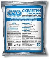 Скелетин с Фосфором необходим для: формирования и укрепления скелета и скорлупы яиц; укрепления суставов и предотвращения их заболеваний; профилактики рахита у молодняка; предотвращения остеопороза и остеомаляции; улучшения переваримости корма; нормализации работы мышечной, эндокринной и нервной систем; регуляции кислотно-щелочного баланса в жидкостях тела; нормализации свертываемости крови. Состав: минералы: кальций (Са), фосфор (Р), марганец (Mn); витамины: Дз; ферментный комплекс; природный адсорбент.