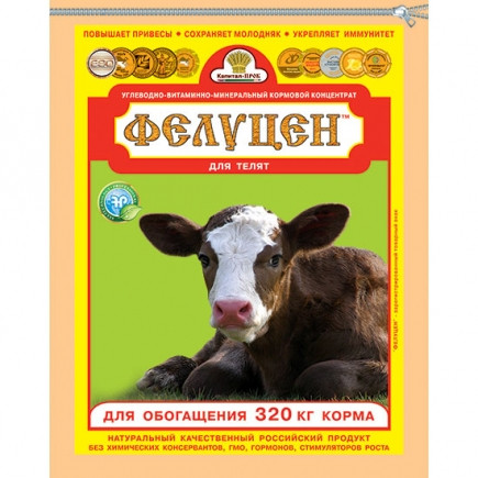 Углеводно-витаминно-минеральный кормовой концентрат для телят, обеспечивает идеальный баланс рациона по всем минеральным и витаминным компонентам, на основе любой кормовой базы.Введение в рацион увмкк «Фелуцен» для телят способствует:нормальному физиологическому развитию молодняка;обеспечению правильного формирования костной и мышечной ткани;профилактике эндемических заболеваний (это болезни, возникающие в результате дефицита или избытка элементов в окружающей среде);улучшению процессов обмена веществ;повышению привесов на 125-280г без дополнительных затрат корма;сокращению срока откорма;улучшению поедаемости и усвояемости кормов.Состав:углеводы (сахара) – источник энергии и питательная среда для рубцовой микрофлорыкальций, фосфор, витамин D3 – для укрепления костной и мышечной системвитамин А и Е- для ростасера – для образования незаменимых аминокислот, здоровья кожи и крепости копытмагний – для укрепления нервной системымедь – для регуляции обменных процессовцинк и кобальт – для кроветворения.