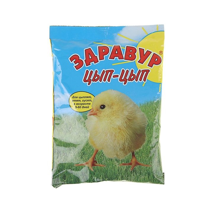 Для цыплят, утят и гусят в возрасте от 5 до 150 дней. При использовании премикса Здравур Цып-цып птенцы быстрее растут, меньше болеют, выглядят крепкими и веселыми. Из молодняка, ежедневно получающего добавку Здравур Цып-цып, вырастают более крупные и здоровые птицы, курицы-молодки начинают раньше нестись, а в будущем от таких кур получают на 15% яиц больше, чем от остальных. Ежедневное применение премикса Здравур Цып-цып: уменьшает отход молодняка в 2-3 раза; снижает заболеваемость в 5-6 раз; ускоряет рост птенцов на 20-25%; создает гарантию будущей высокой продуктивности птицы; предохраняет от рахита, искривления ног, нарушения обмена веществ и болезней глаз. Состав: 14 витаминов, 7 микроэлементов, 2 аминокислоты и мультиферментный комплекс.