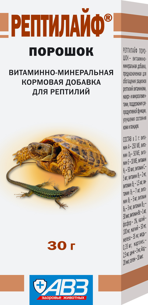 Черепахам и ящерицам для нормализации обмена веществ, повышения резистентности организма, восполнения недостаточности витаминов, макро- и микроэлементов, поддержания репродуктивной функции, улучшения состояния кожи и панциря в периоды интенсивного роста, и при стрессах.