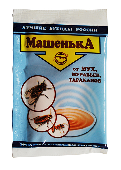Инсектицидное средство Машенька - готовая приманка с пищевыми привлекантами. Действие приманки начинается через 10 минут после раскладки и сохраняется в течение 2 месяцев. Специальный горький компонент (битрекс) исключает поедание приманки животными и птицами. Средство Машенька представляет собой мелкие сыпучие гранулы желтого, или оранжевого, или сиреневого и необходимо для уничтожения: тараканов, муравьев домовых и садовых, мух и др.