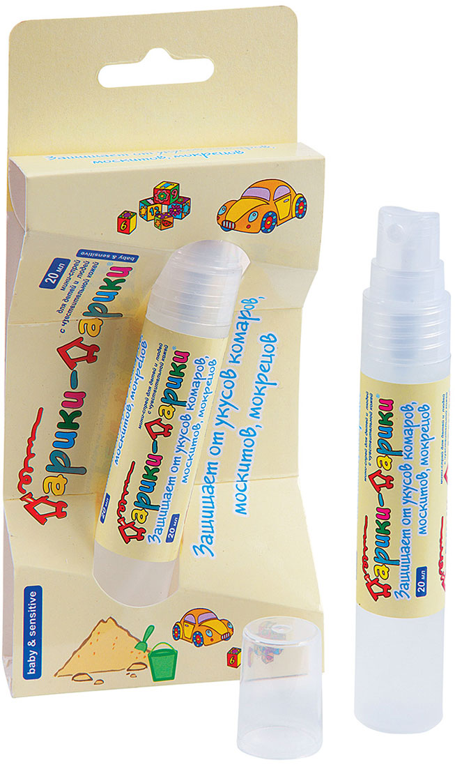 Мини-спрей от комаров Дарики для защиты детей и людей с чувствительной кожей от укусов комаров, москитов и мошек. Активная субстанция «ИР3535» практически не впитывается кожей, а в течение всего времени находится только на ее поверхности. Мини-спрей защищает от укусов насекомых не менее 2-х часов после нанесения на кожу. При этом он не раздражает кожу и не вредит здоровью. Не содержит спиртов.