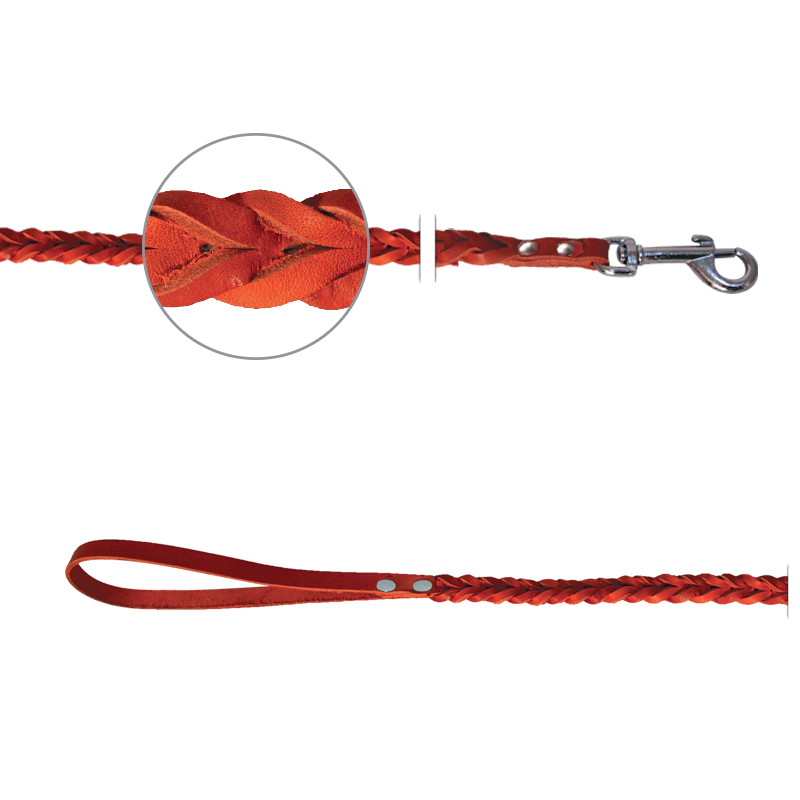 Прочный, долговечный и оригинальный кожаный поводок с плетением "косичкой". Поводок применяется для прогулок и дрессировки. Изделие снабжено надежным металлическим карабином, а специальный переходник позволяет карабину крутиться вокруг своей оси, предотвращая запутывание. На поводке имеется петля, которая одевается на руку для более удобного использования. Размер изделия: 10х1100мм.