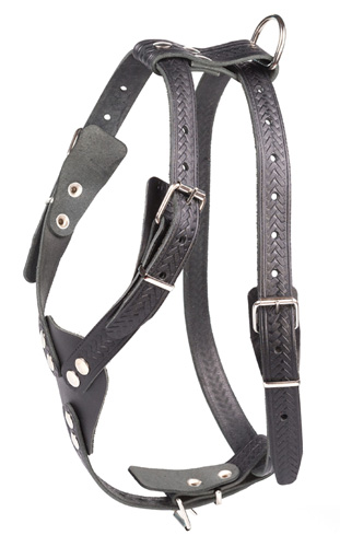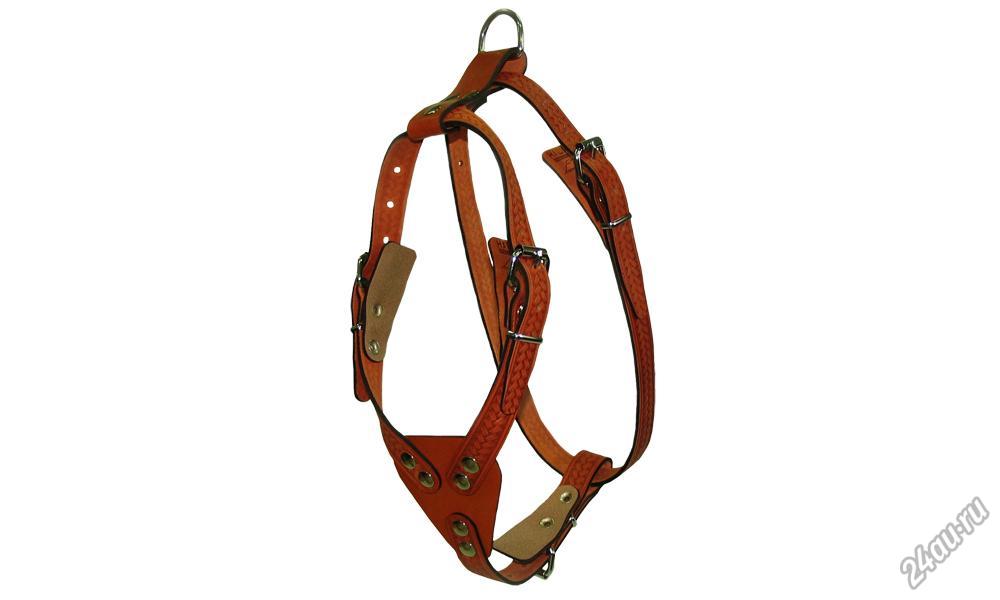 Шлейка из натуральной кожи, однослойная, с тиснением. Нагрудный треугольник, 4 регулировочных ремня.