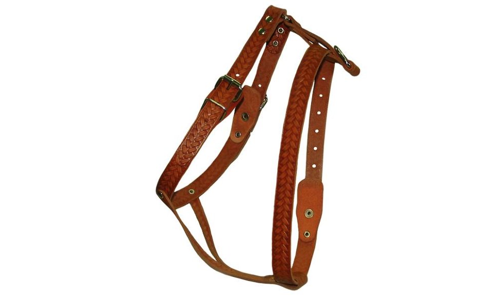 Эргономичная шлейка из натуральной кожи, учитывающая породные особенности собаки, однослойная, с тиснением, 3 регулировочных ремня для подгонки размера.