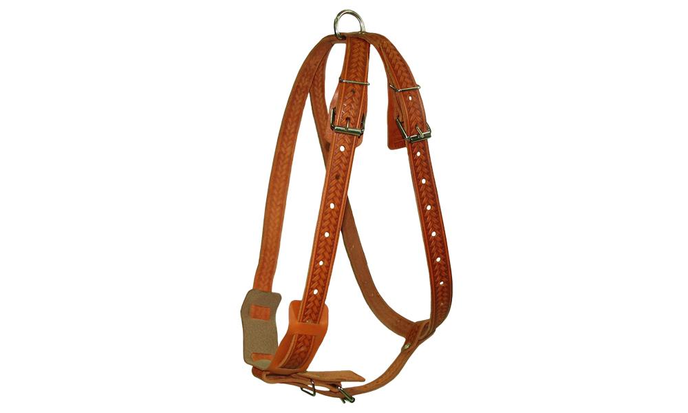 Эргономичная шлейка, учитывающая породные особенности собаки, однослойная, из натуральной кожи с тиснением, 3 регулировочных ремня для подгонки размера.