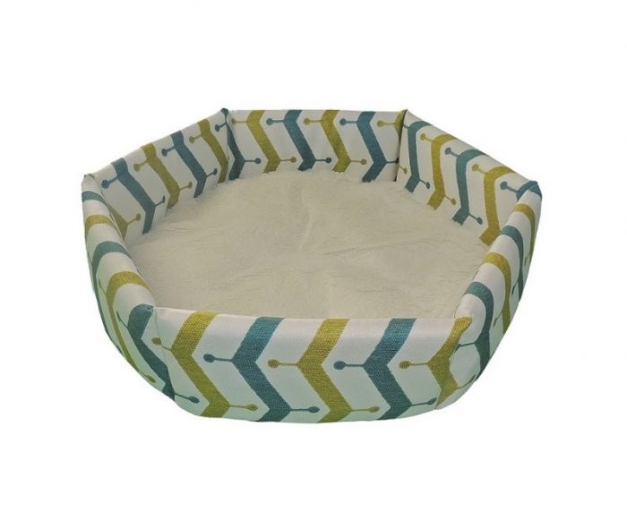 Изделие выполнено в форме шестиугольника, изготовлено из плотной мебельной ткани, наполнение поролон 20мм. Диаметр изделия с внешней стороны 57см, с внутренней 49см, высота бортиков 16см. Съемный матрасик выполнен из качественного искусственного меха с одной стороны и х/б (бязь) с другой, диаметр 57см