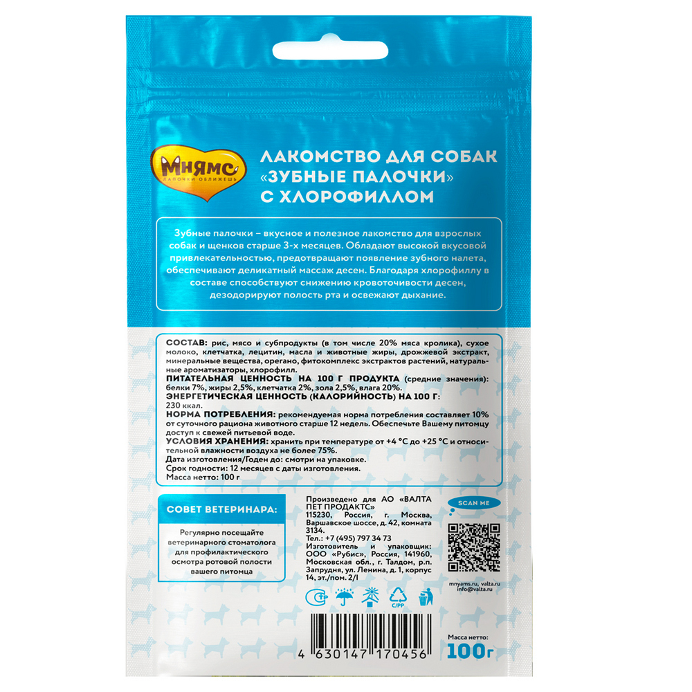 - Мнямс DENTAL "Зубные палочки" с хлорофиллом – вкусное и полезное лакомство для взрослых собак и щенков старше 3-х месяцев.