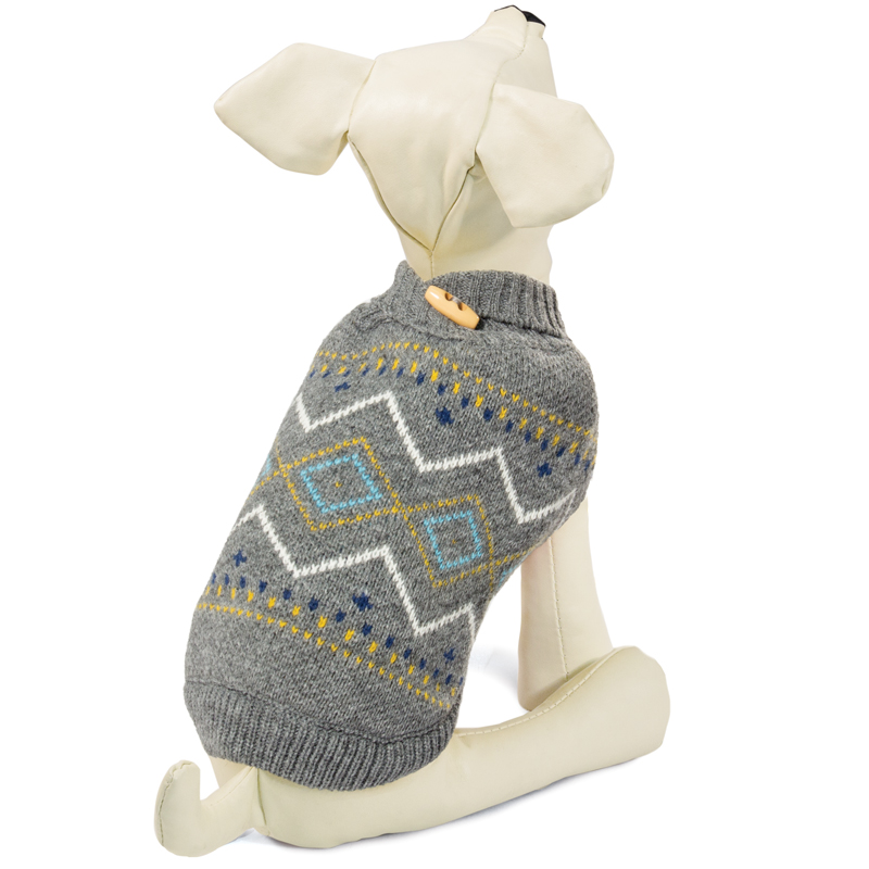 Теплый и оригинальный свитер с геометрическим узором - это удобный и функциональный аксессуар для собак, который просто незаменим в холодную погоду. Изделие защитит вашего питомца от ветра и согреет в непогоду. Свитер имеет стильный дизайн и декорирован объемной пуговицей в зоне ошейника. При этом универсальный и продуманный до мелочей фасон не стесняет движений питомца во время прогулки. Такой свитер с модным принтом станет украшением гардероба вашего питомца. Материал: акрил. Цвет: серый. Размер: 35см (L).