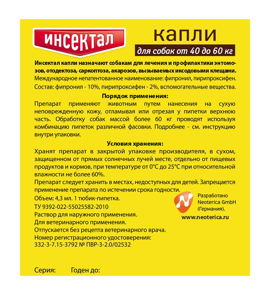Инсектал для собак капли на холку 40-60кг (1 пипетка)