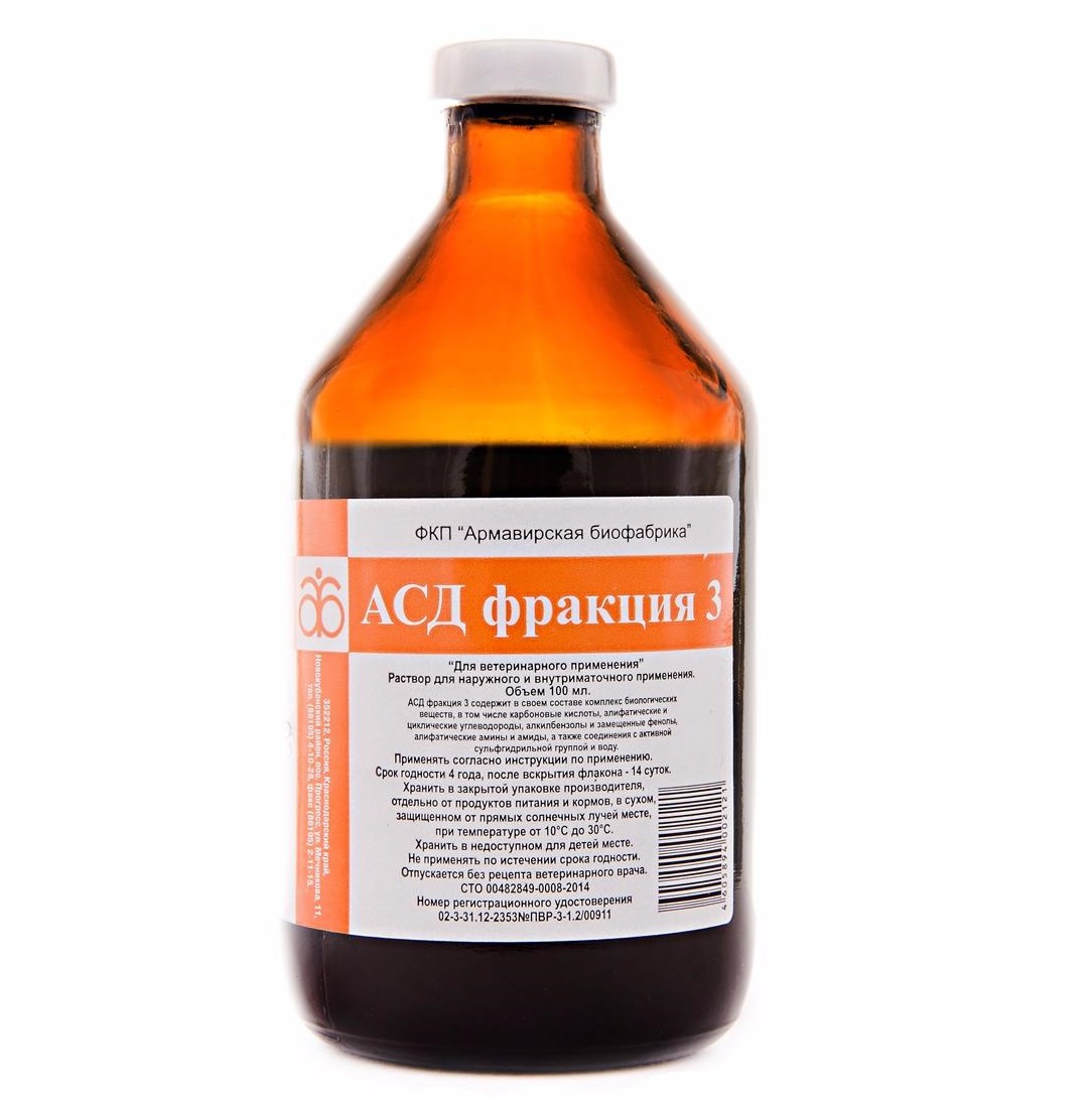 Препарат АСД–З является продуктом сухой перегонки сырья животного происхождения. Содержит в своем составе карбоновые кислоты, алифатические и циклические углеводороды, алкилбензолы и замещенные фенолы, алифатические амины и амиды, соединения с активной сульфгидрильной группой и воду. Препарат АСД-З назначают животным наружно в нативном виде или в форме 20-50% масляных растворов. Применяется для лечения инфицированных вяло заживающих ран, дерматитов, хронических воспалительных повреждений кожи и копыт, трофических язв, свищей, копытной гнили овец и некробактериоза у животных, а также гинекологических заболеваний различной этиологии.
