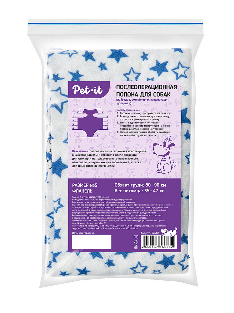 Послеоперационная попона для собак Pet-it №5 (80-90см,35-47кг) фланель 22542